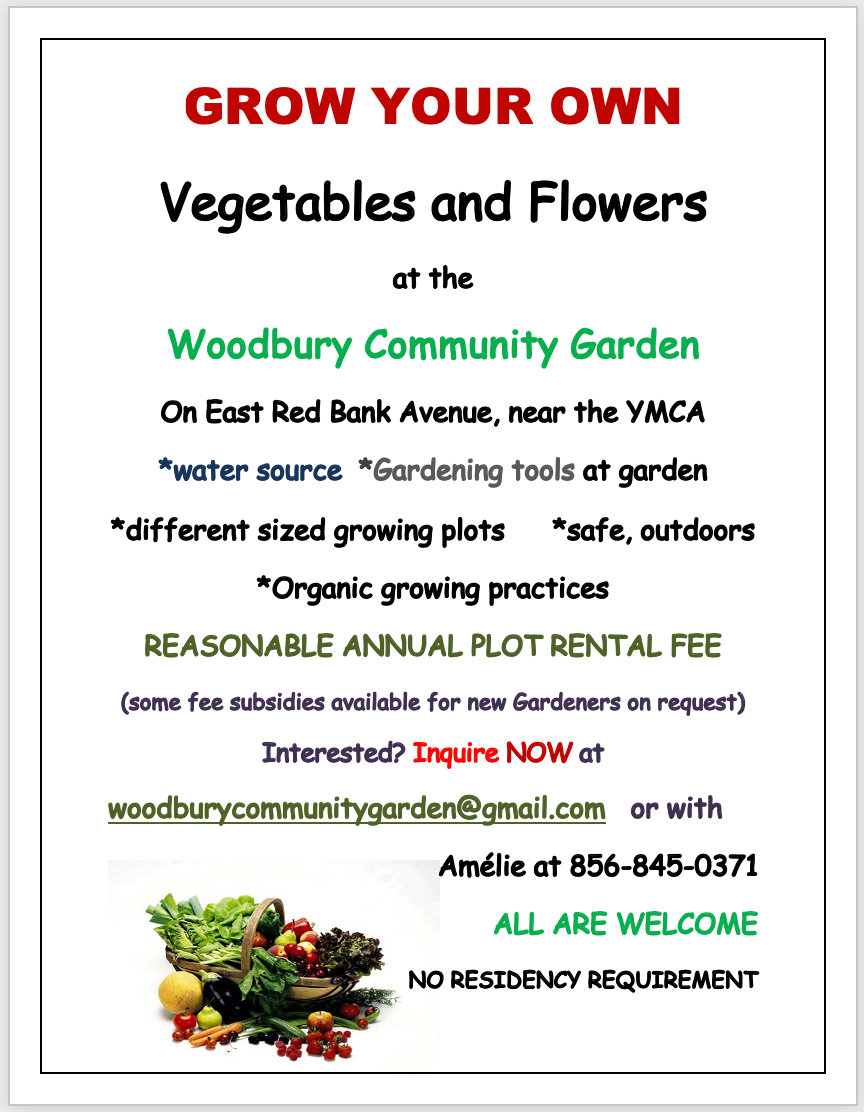 Plots are still available at the Woodbury Community Garden on East Red Bank Avenue in Woodbury, NJ. Email: WoodburyCommunityGarden@gmail.com